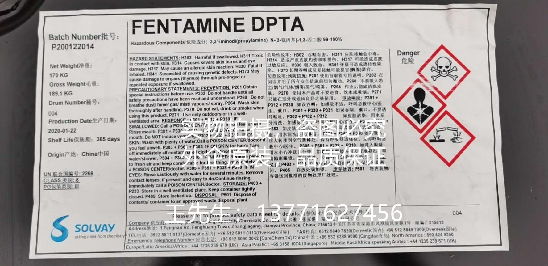 安全防護 | 二丙烯三胺(DPTA,3,3'-二氨基二丙胺)為化工合成中間體原料,使用過程中請避免與眼睛及皮膚接觸,若有接觸,請及時用大量清水沖洗并送醫診治; |