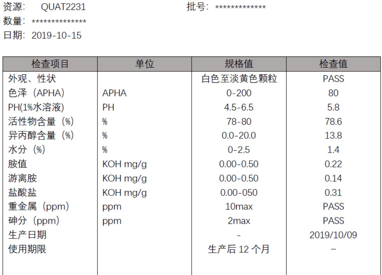 產品應用: | 二十二烷基三甲基氯化銨(2231,山崳基三甲基氯化銨)作為柔軟劑,用于高檔護發素,其作用優于十六、十八三甲基氯化銨。能提供頭發很好的柔軟感,改善頭發的干濕; 二十二烷基三甲基氯化銨(2231,山?;谆然@)具有優秀的調理性、抗纏繞性,以及特別優異的抗靜電性。適用于調理香波、免沖洗護發素、護手霜或潤膚乳液,特別適用于正常及濃密發量的頭發。洗護產品添加二十二烷基三甲基氯化銨(2231,山?;谆然@)可以使頭發具有優越的濕梳性和抗打結性,并在頭發上覆蓋一層使頭發順滑的薄膜,特別適合要求優越調理效果且無積聚性的護發產品。 二十二烷基三甲基氯化銨(2231,山?;谆然@)與陽離子、非離子表面活性劑或染料有良好的配伍性。發用調理劑,是非常有效的調理劑,優越的濕發、干發手感和梳理性。良好的抗靜電效果,可分散在水中。 二十二烷基三甲基氯化銨(2231,山?;谆然@)的功效: 1、優異的調理性,使頭發閃亮、飄逸、易梳理、順滑; 2、不降泡、不降粘、不影響產品穩定性; 3、產品應用便利,不改變洗發水生產工藝; 4、溶劑氣味??; 5、游離胺少,無刺激; 二十二烷基三甲基氯化銨(2231,山?;谆然@)產品應用 洗發水,焗油膏,護發素 |