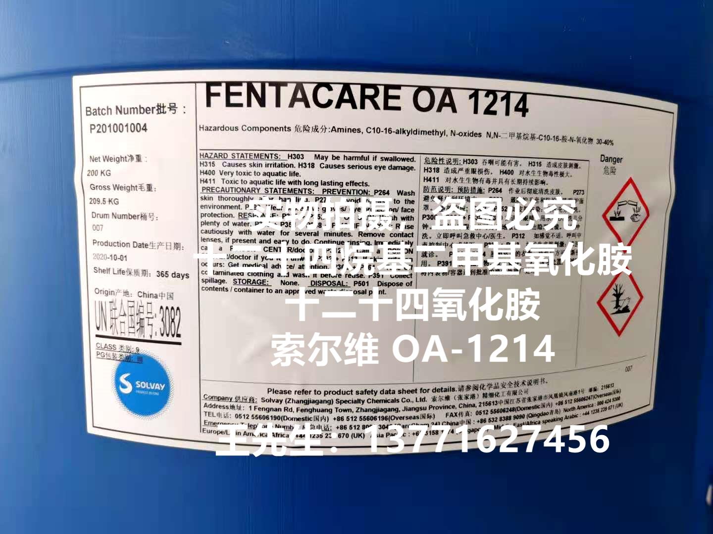 包裝 | 十二烷基二甲基氧化胺(OA-12,LAO,月桂基二甲基氧化胺)為50,200公斤/桶包裝;貯于室內陰涼通風處,防潮、嚴防曝曬,貯存期十二個月。 | |